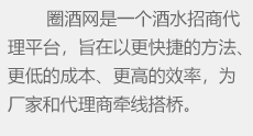 圈酒招商網(wǎng)是繼糖酒會(huì)之后的招商模式,為酒廠等生產(chǎn)經(jīng)銷(xiāo)企業(yè)搭建一個(gè)更好、更快的酒水招商平臺(tái)